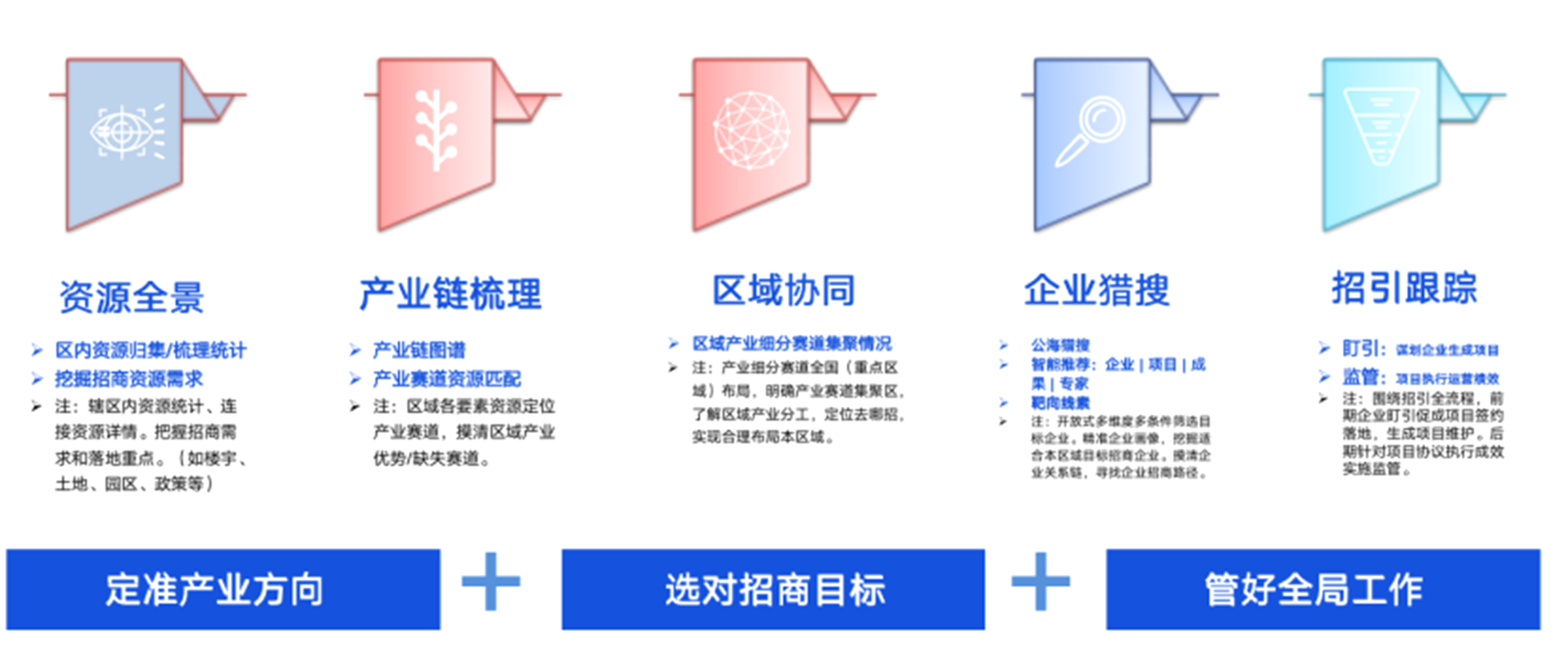 打造区域产业链协同创新发展平台,推动十大科创板块落地园区,包含区域产业全景分析、优化创新资源配置、高企培育、招商项目精准推荐、招商资源管理、招商绩效考核、履约管理、招商项目精准推荐、企业转型升级分析和科技成果精准匹配,实现地市支柱产业的产业链和数字化深度融合。