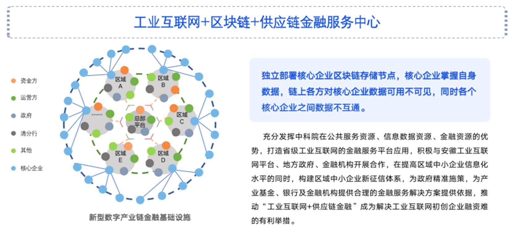 搭建区域供应链金融公共服务平台,打造区块链作为底层的公共基础设施,建设供应链金融作为上层应用设施,将区域内重点企业设为企业节点,由政府设立监管节点,组织由政府、产业主体、金融机构、技术提供企业、监管部门等多方参与的运营体系,邀请银行、非银机构、供应商加入同一联盟链,搭建科学的组织架构及职责配置,将供应链金融公共服务平台纳入全市政府基础设施。